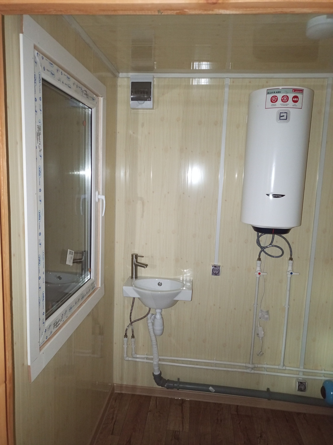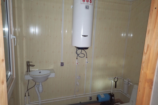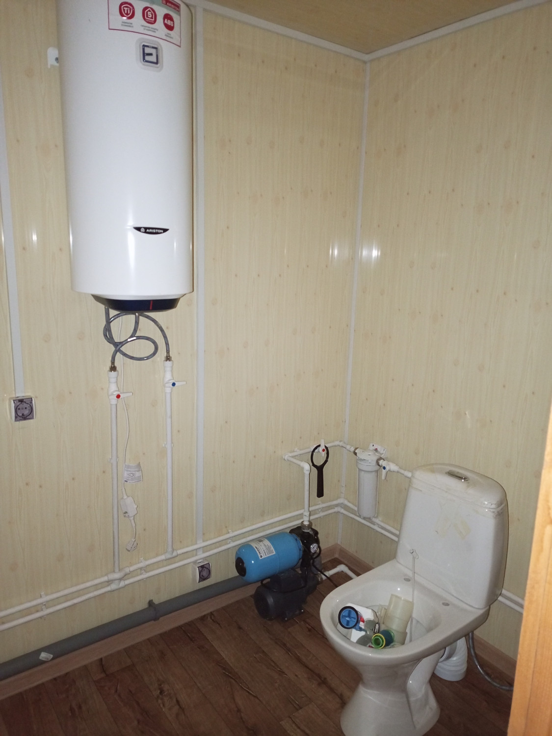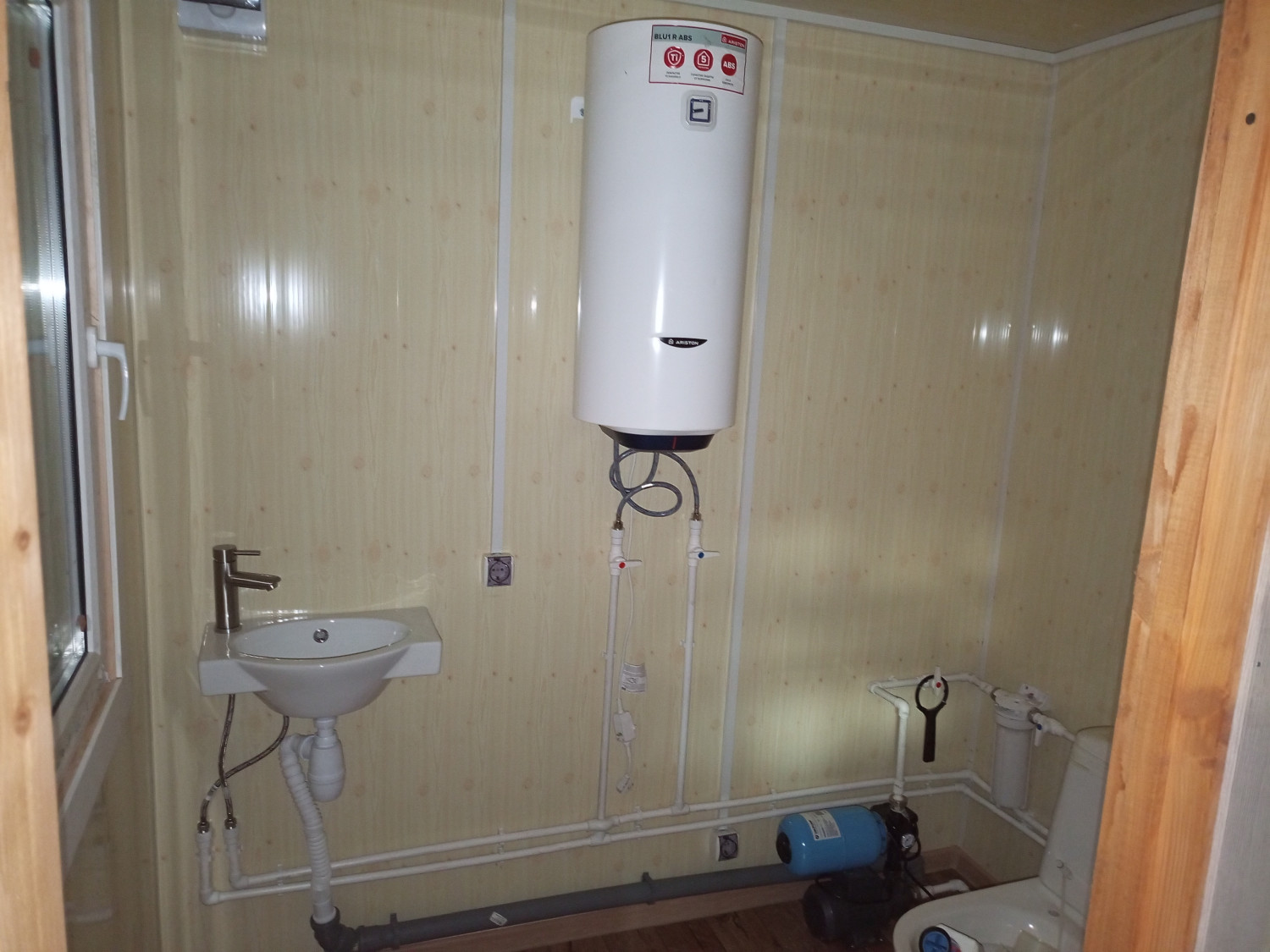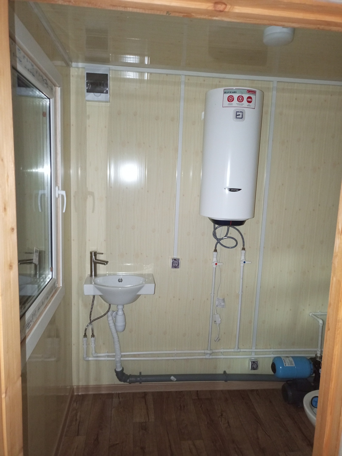 Блок-контейнер с душевой кабиной, эл/нагревателем, туалетом, раковиной и насосной станцией